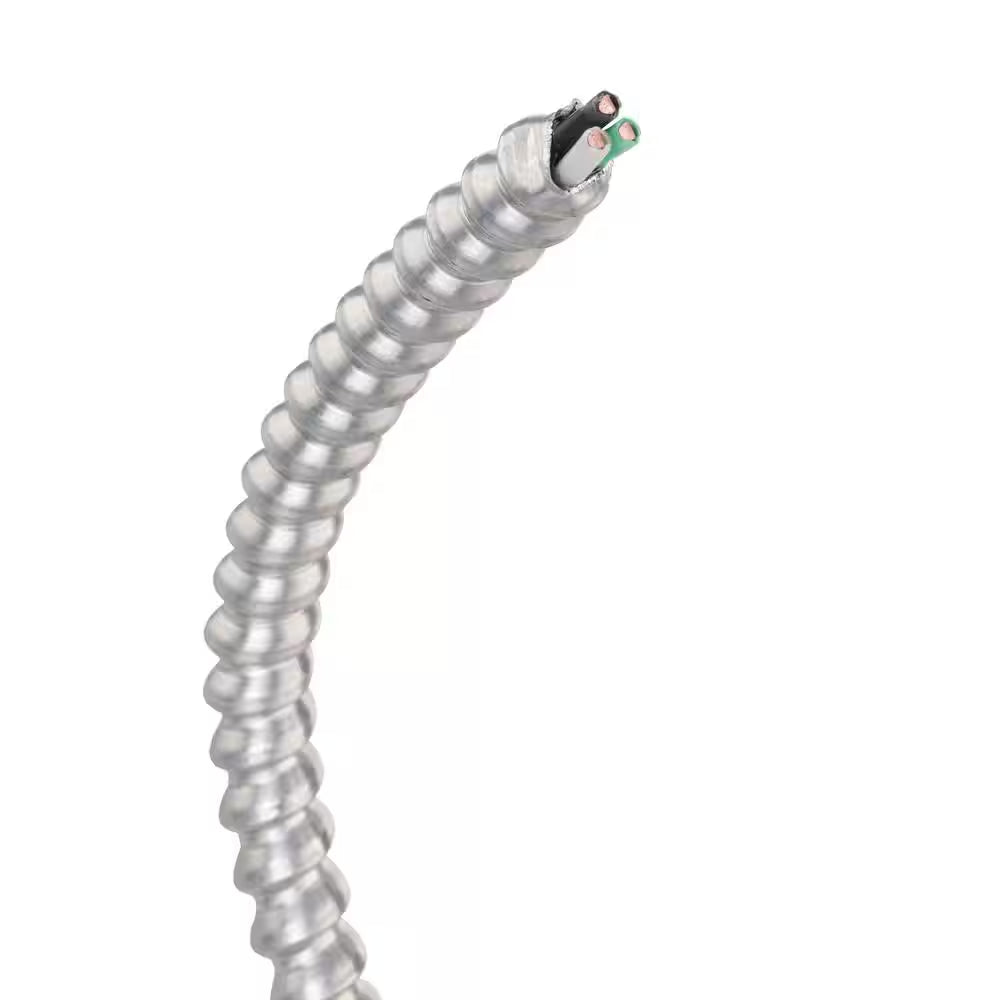 Southwire Armorlite Type MC Cable is constructed with soft-drawn copper, Type THHN/THWN conductors rated 90 degree C dry available in sizes 14 AWG through 2 AWG and a green insulated grounding conductor. The conductors are cabled together and a binder tape bearing the print legend is wrapped around the assembly. Aluminum interlocking armor is applied over the assembly.