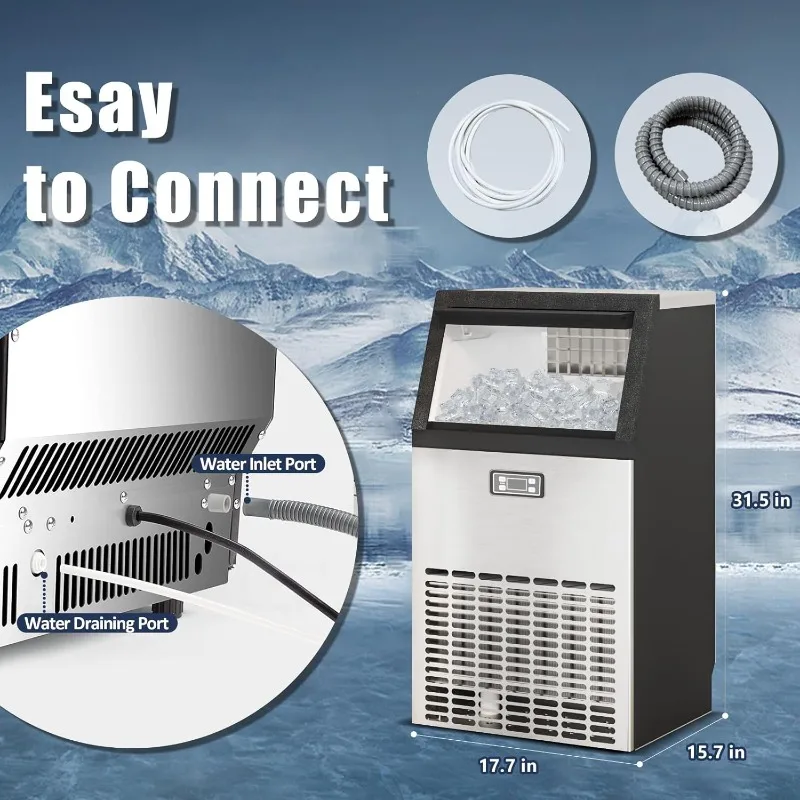 - Convenient to Control- Through the functional LCD panel on this ice maker machine,any operation you want can be solved,the panel shows the status of the commercial ice maker, to ensure the efficiency of ice making. You can adjust the thickness of ice cubes by adjusting the ice making time. The industrial ice machine will clean automatically when you press the clean button for 5s.