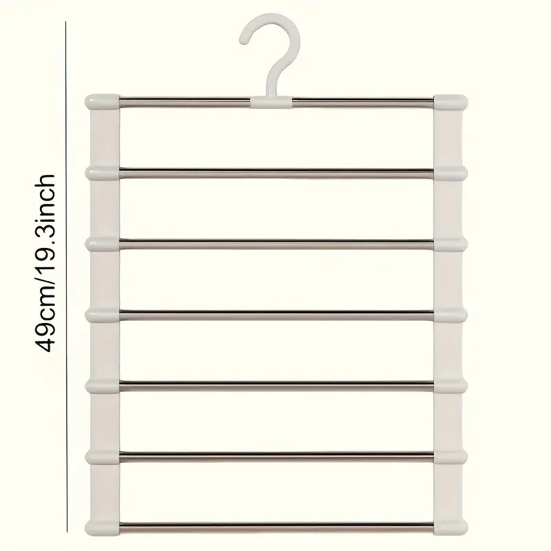 Streamline your closet with this 2-pack of Folding Multi-Layer Pants Hangers. Constructed from rust-resistant stainless steel and sturdy ABS plastic, each hanger features five fold-down bars to organize jeans, trousers, leggings, scarves, and ties in a vertical space-saving design. The swiveling hook allows easy access to any tier, while the foldable bars pivot out of the way when not in use. Ideal for home closets, retail displays, or shopping mall showrooms, these sleek, durable hangers maximize wardrobe capacity and keep garments wrinkle-free and visible.