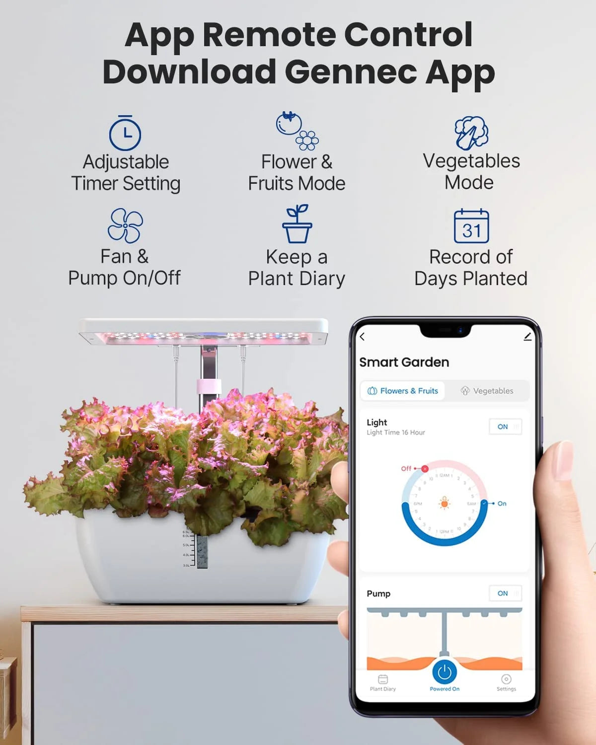 The iDOO hydroponic grow system is WiFi enabled and can be controlled through the "Gennec" app from anywhere. Adjust light schedules, fan and pump runtime, and keep a diary for your favorite plants.