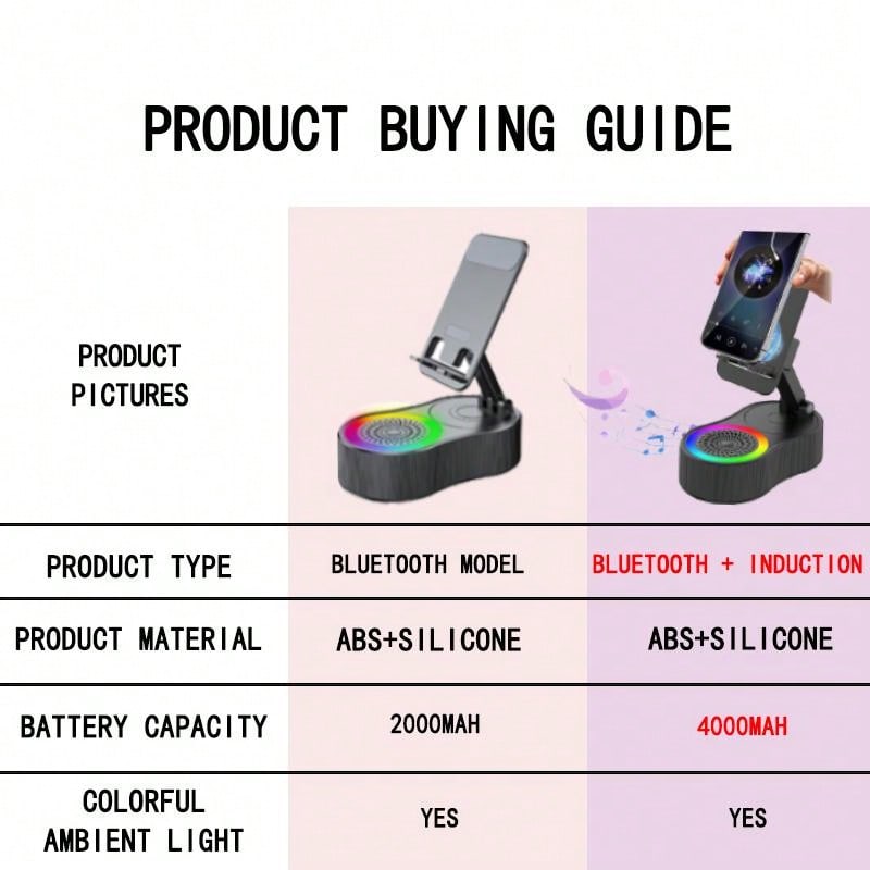 Experience powerful sound and convenience with the 2025 Wireless Induction Bluetooth Speaker. A 5-in-1 design featuring a foldable adjustable phone/tablet holder, colorful ambient light, and rechargeable compact build. Perfect for Android, iPhone, and everyday use.