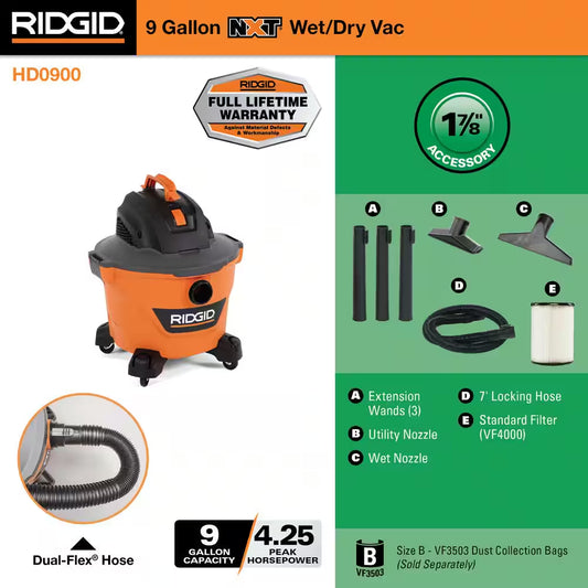 9 Gallon 4.25 Peak HP NXT Shop Vacuum Wet Dry Vac with General Debris Filter, Locking Hose and Accessory Attachments