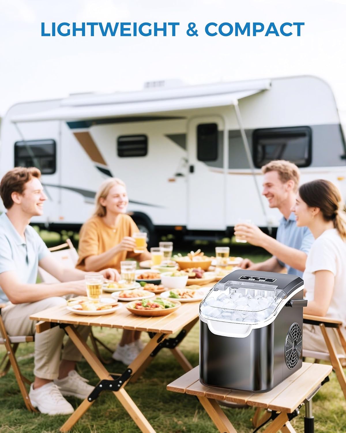 - Portable and Space-Saving: This ice maker has a compact design and comes with a handle, making it easy to carry. The ice maker weight is 11.75 pounds.