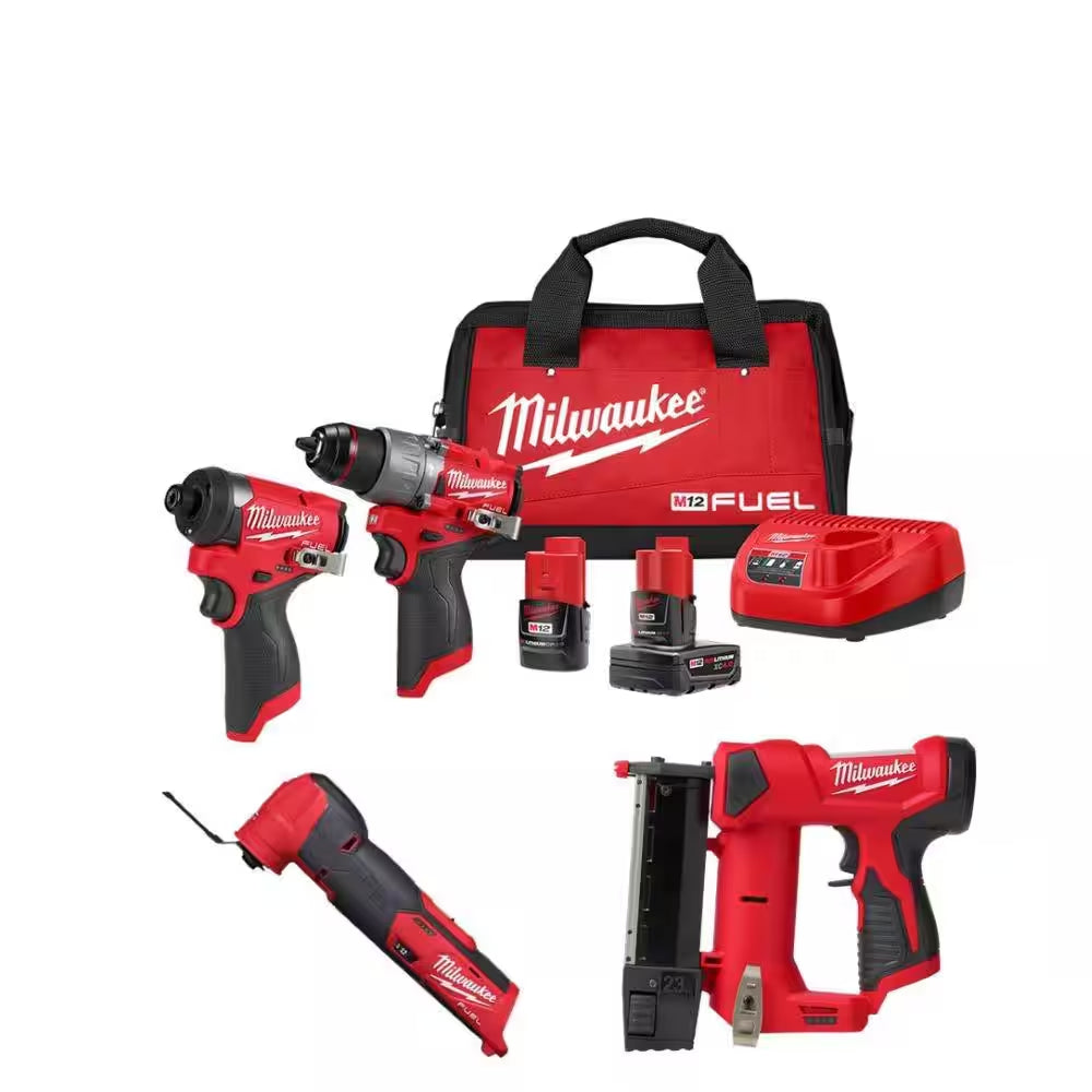 Milwaukee M12 FUEL 2-Tool Combo Kit has the Most Powerful Subcompact Drill, the Fastest Driving Subcompact Impact Driver while being the overall Most Compact Drill and Impact Driver. Includes Milwaukee M12 FUEL 1/2 in. Drill Driver, M12 FUEL 1/4 in. Hex Impact Driver, M12 REDLITHIUM XC 4.0Ah Battery Pack, M12 REDLITHIUM CP 2.0Ah Battery Pack, with an M12 charger and a contractor bag. The M12 FUEL 1/2 in. Drill/Driver is the Most Powerful Subcompact Drill Driver, the most compact in size and has the fastest speed under load. The POWERSTATE brushless motor delivers the most power on the widest variety of applications. The portable drill is the shortest solution in its class offering maneuverability and access to tight spaces. Milwaukee REDLINK PLUS Intelligence delivers top of the line thermal performance to give users the Fastest Speed Under Load. Milwaukee M12 FUEL 1/4 in. Hex Impact Driver is the Fastest Subcompact Impact Driver, the Most Compact and provides Maximum Workspace Visibility. At 5 in. L and 7.6 in. tall (with M12 CP 2.0 Ah battery), this solution is the most overall compact impact driver in its class. Tri-LEDs surround the bit accessory with brighter lights and fewer shadows providing maximum visibility. Using M12 REDLITHIUM 2.0Ah compact and 4.0Ah extended capacity battery packs will deliver more work per charge. The M12 FUEL Impact Driver and M12 FUEL 1/2 in. Drill Driver are part of Milwaukee M12 System which is fully compatible with over 125 solutions.