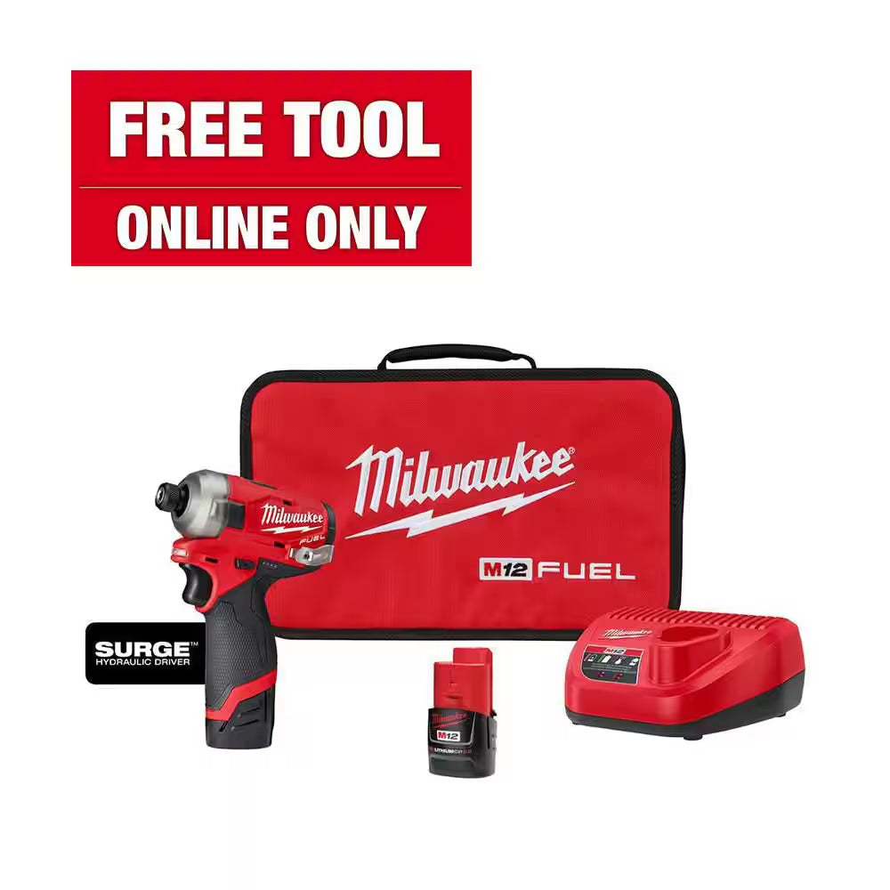 The Milwaukee M12 FUEL SURGE 1/4 in. Hex Hydraulic Driver is the industry's first 12-Volt hydraulic impact driver. Featuring the FLUID-DRIVE Hydraulic Powertrain, the hydraulic impact will allow users to experience operation up to 2X quieter with less vibration for smoother and faster driving speeds compared to standard impacts. The compact size of the tool and battery provides users with unmatched access in tight spaces and allows for easy transport on a tool belt and easy fitting into a job site tool bag. Performance is not sacrificed despite lower peak torque due to its Longer Sustained Torque that allows the tool to complete core users most common applications. The POWERSTATE Brushless Motor delivers up to 0 RPM to 3,000 RPM with constant power output to drive screws faster. Built-in REDLINK PLUS intelligence is the most advanced electronic system on the market, preventing damage to the user's tool and battery caused by overloading or overheating. The cordless impact driver is compatible with all Milwaukee M12 REDLITHIUM Compact Batteries or Extended Capacity Batteries, delivering users with more work per charge and more work over the life of the pack than competitive batteries. In addition to the M12 FUEL SURGE 1/4 in. Hex Hydraulic Driver, this kit includes two M12 REDLITHIUM CP2.0 batteries and a contractor bag.